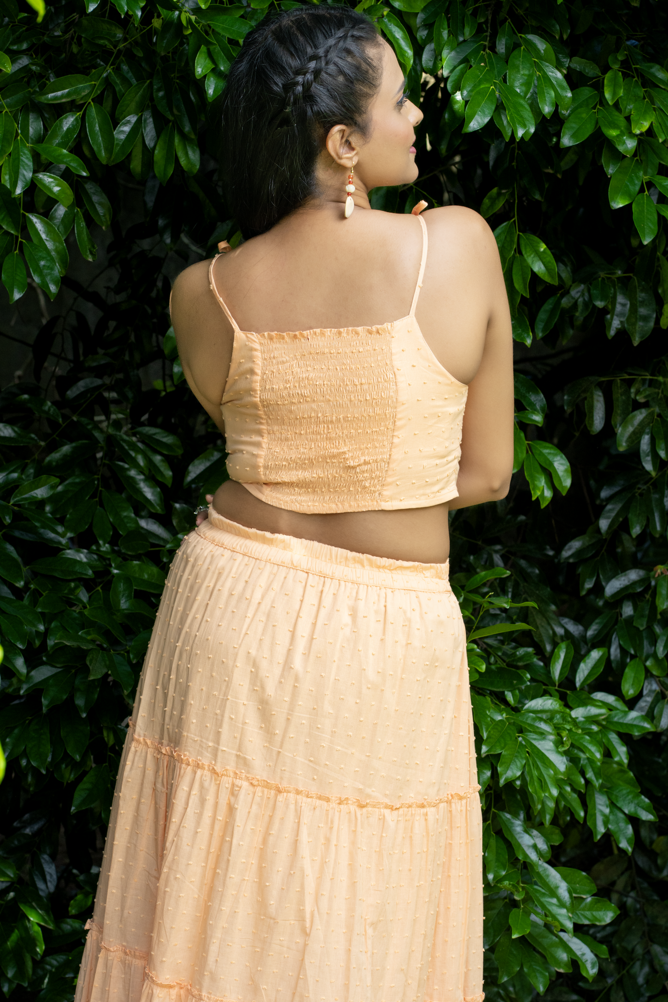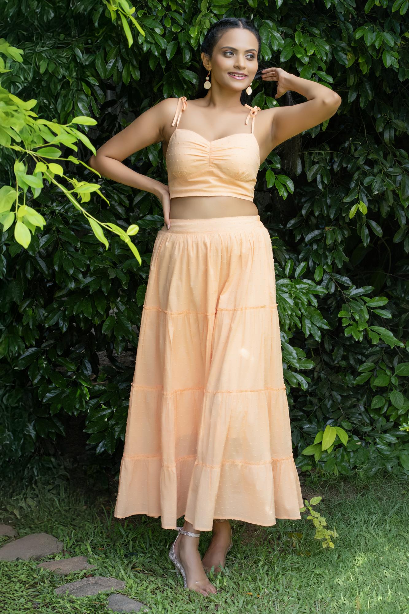 A Vibrant Apricot Orange Two Piece Set Featuring A Stylish Crop Top And Flowing Long Skirt. Breezy, Elegant And Perfect For Casual Outings.