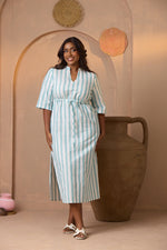 Effortlessly chic, this midi dress features refreshing mint and white stripes in a breezy silhouette. The cinched drawstring waist creates a flattering shape, while the side slits add a touch of modern movement.