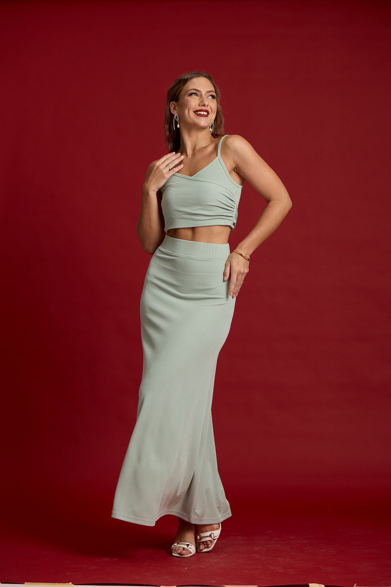 the coordinated essential. an effortlessly chic two-piece set featuring a ribbed crop top and a matching figure-skimming maxi skirt. the perfect blend of comfort and polished style for any occasion.