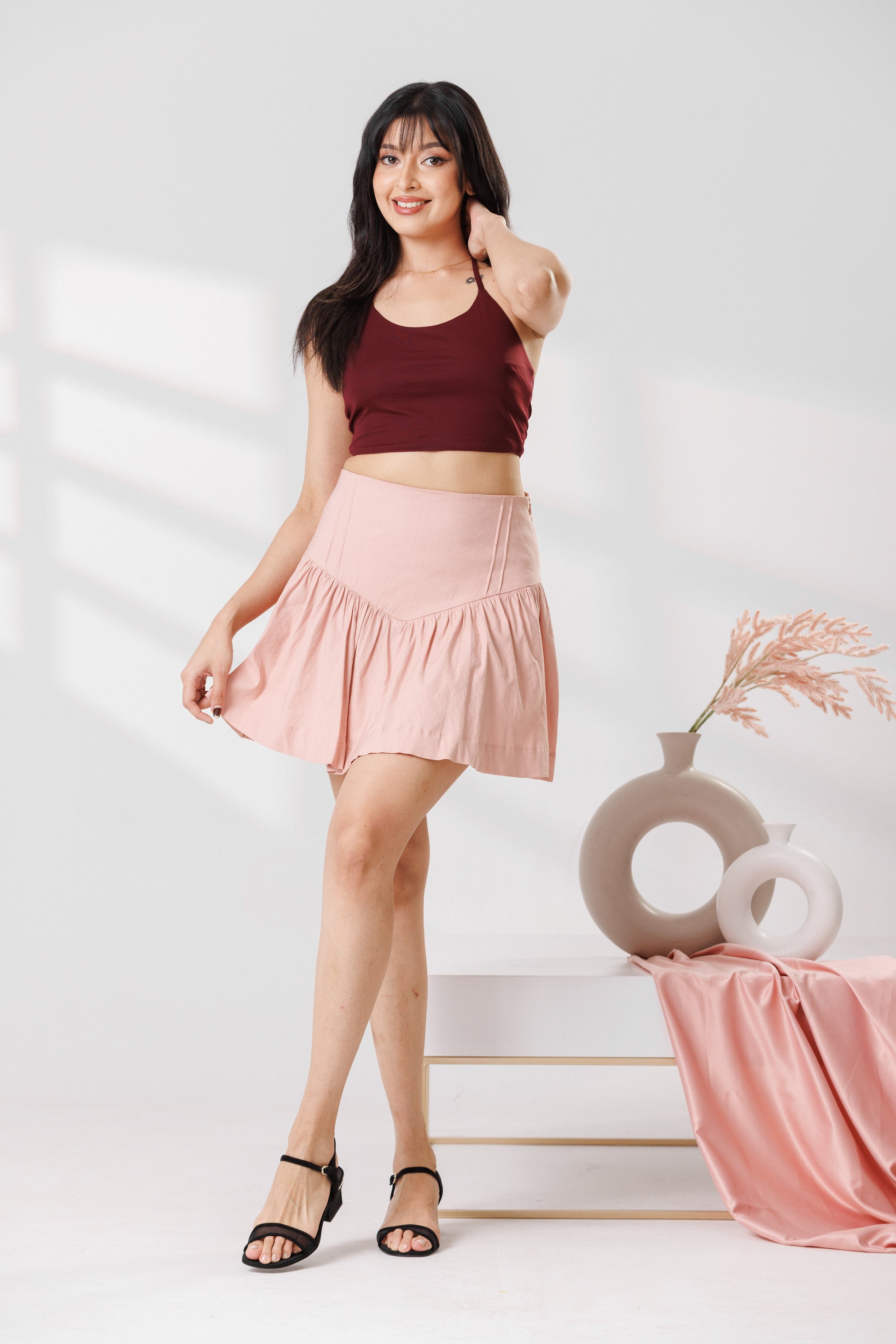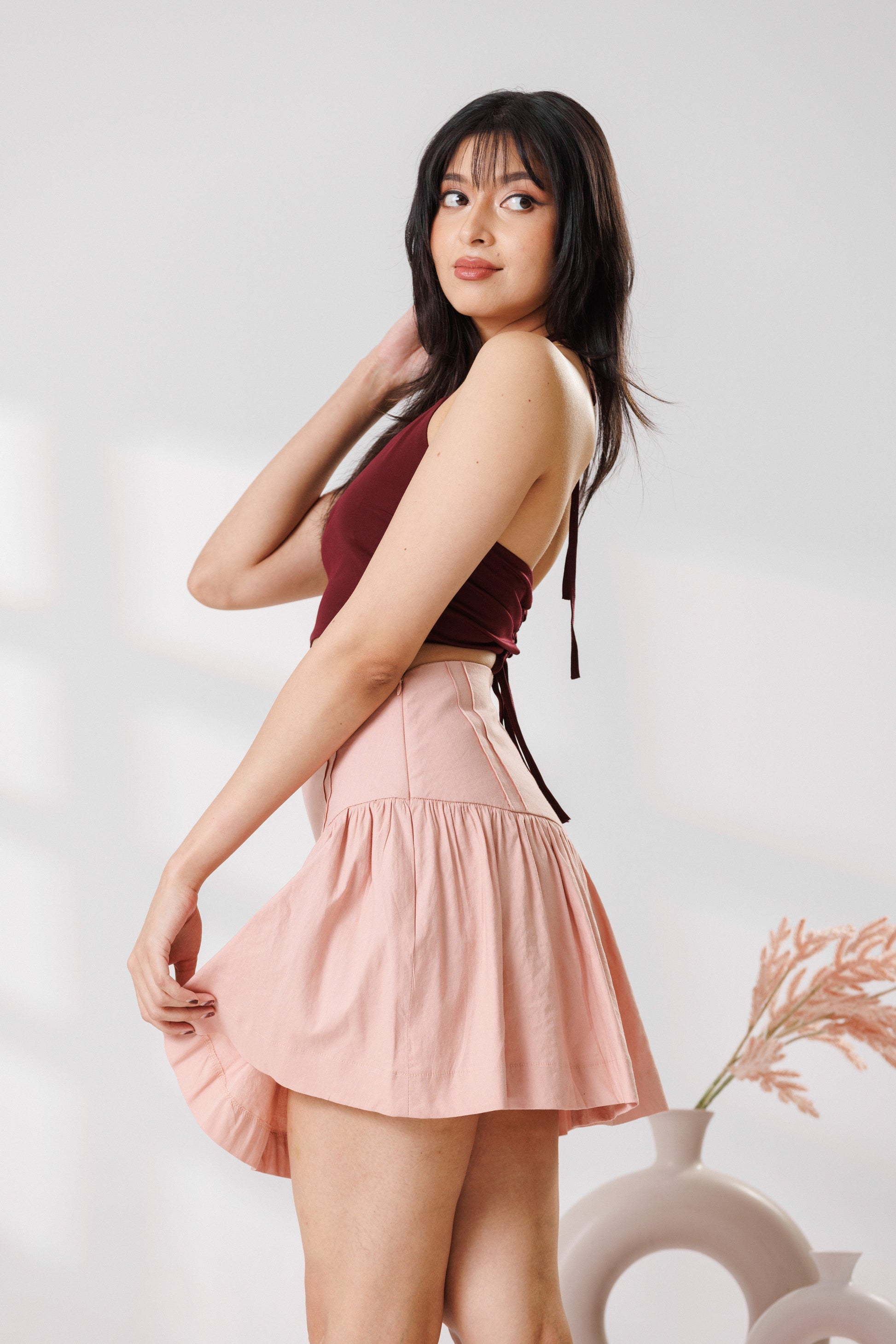 Sweet and flirty, this blush pink skirt features a flattering drop-waist and playful ruffles. Crafted in breathable cotton, it’s the perfect breezy staple for your next sunny date night.
